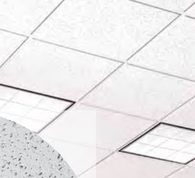 Placa de cielorraso desmontable de fibra mineral con buen comportamiento acústico. Durable, lavable, restregable